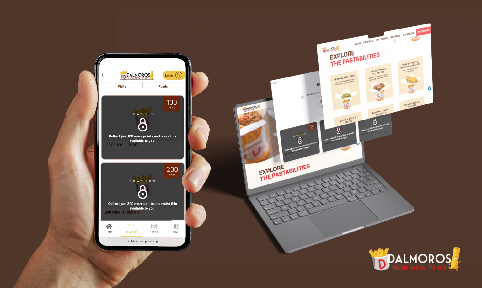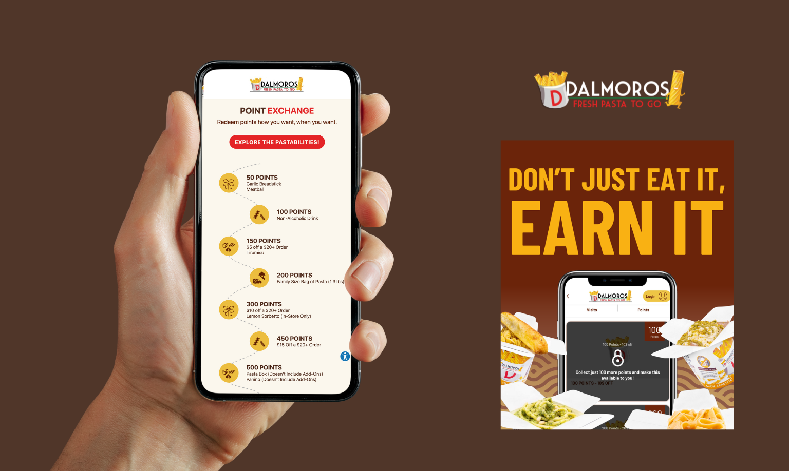To strengthen customer retention and reward their most loyal guests, we developed and launched a comprehensive loyalty program. This included creating the strategic framework for the program itself, designing and naming distinct membership tiers, planning the rewards structure, and determining the incentives that would drive repeat visits and increased spend. Tailored copy for every stage of the customer journey further enhanced the loyalty experience. This included push notifications, text messages, email campaigns, and in-store signage that educated guests about the program and enticed them to sign up. Each piece of communication was designed to reinforce the value proposition while maintaining DalMoros' authentic brand voice. By creating a cohesive messaging ecosystem across digital and physical touchpoints, customers understood not just how the program worked, but why joining made their DalMoros experience even better.
